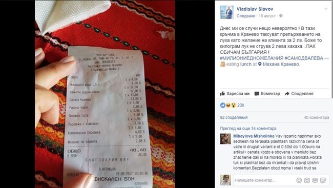 "Днес ми се случи нещо невероятно ! В тази кръчма в Кранево таксуват препържването на лука като желание на клиента за 2 лв. Боже то килограм лук не струва 2 лева хахаха...ПАК ОБИЧАМ БЪЛГАРИЯ !", написа Владислав Славов, недоволен клиент на заведение в Кранево, под снимката на касовия бон.