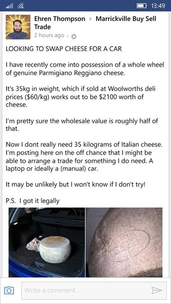 „Не са ми необходими цели 35 кг италианско сирене. Публикувам, в случай че може да се осъществи размяна за нещо, от което имам нужда. Лаптоп или в най-добрия случай кола (с ръчна трансмисия)“, посочва търговецът.