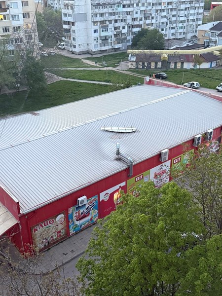 Потенциално опасна ситуация в русенския квартал "Чародейка-юг" тревожи местните жители. Разместена рекламна конструкция на покрива на магазин "Пацони" създава риск за хора и автомобили в района.