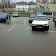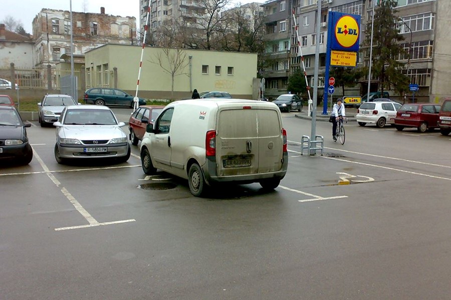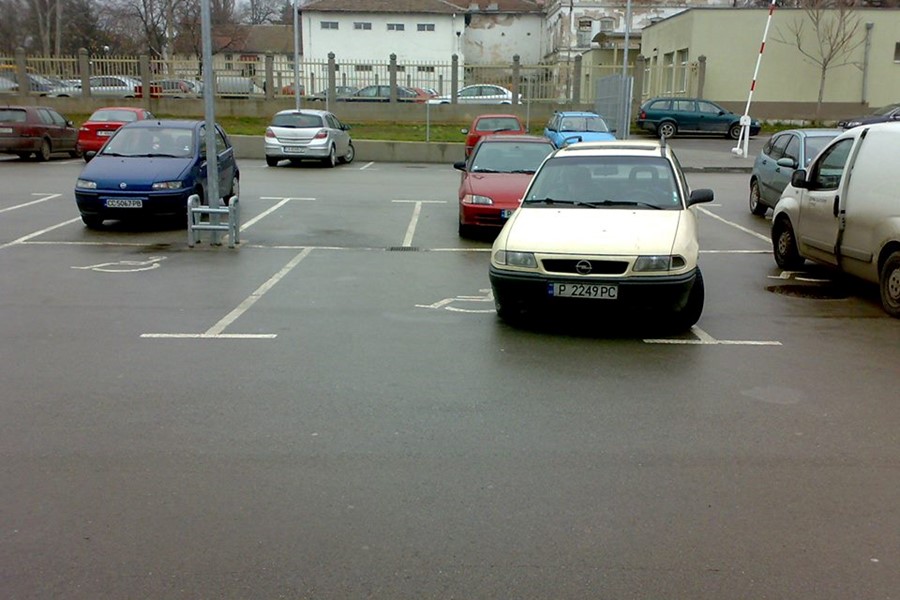 Въпреки че паркингът съвсем не изглежда пълен, шофьорите на тези два автомобила са решили, че най-удачно е да паркират на местата за инвалиди.