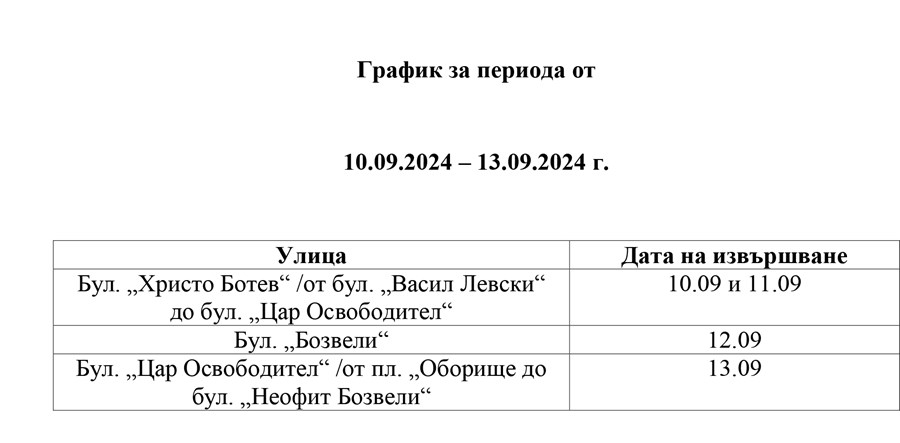 През настоящата седмица се планира почистването на булевард „Христо Ботев“ (в участъка от булевард „Васил Левски“ до булевард „Цар Освободител“), булевард „Бозвели“, както и булевард „Цар Освободител“ (от площад „Оборище“ до булевард „Неофит Бозвели“).