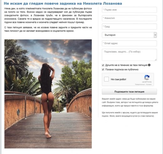 От няколко часа в интернет се събират подписи срещу задните части на плеймейтката Николета Лозанова.