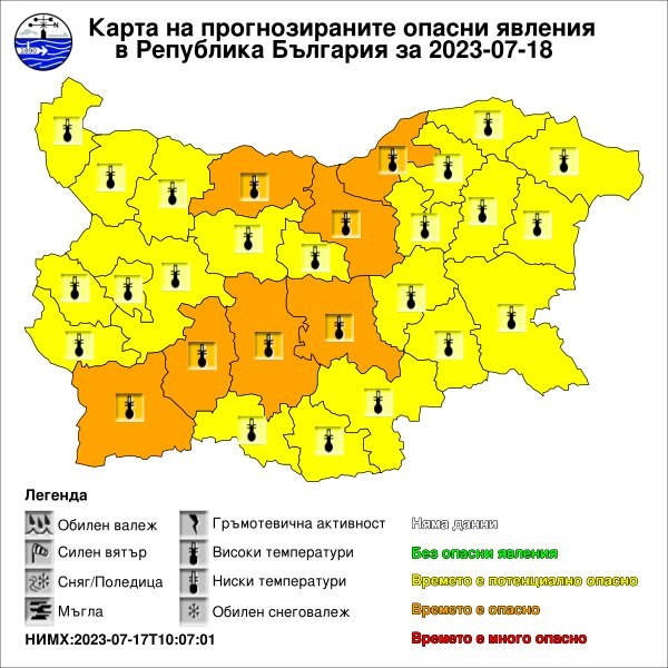 В Плевен, Велико Търново, Русе, Стара Загора, Пловдив, Пазарджик и Благоевград е възможно температурите да достигнат до 39-40 градуса. В останалата част от страната са очаквани температури 35-38 градуса.
