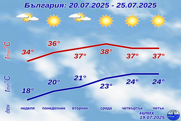 Седмичната прогноза показва стабилно високо атмосферно налягане над страната, което гарантира предимно ясно небе и малко облачност. Единствените по-значителни промени ще бъдат свързани с развитието на следобедна купеста облачност в планинските райони.