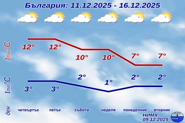 Сравнително топло за сезона време с температури до 15 градуса очаква страната в дните до края на седмицата. Това става ясно от седмичната прогноза за периода 11 – 16 декември, публикувана от Националния институт по метеорология и хидрология (НИМХ).