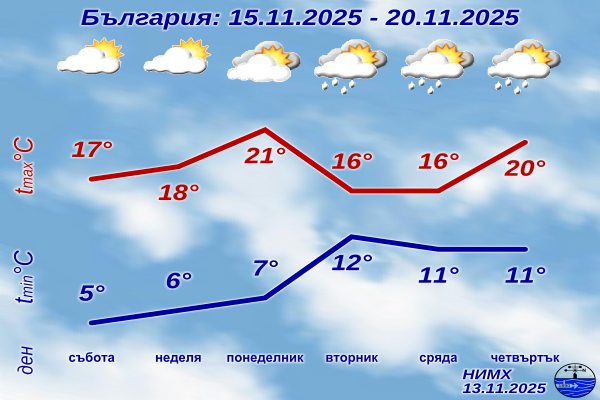 Температурите отново ще тръгнат нагоре, като в четвъртък (20 ноември) сутрешните стойности ще са между 8° и 13°, а максималните ще варират в диапазона от 18° до 23°.