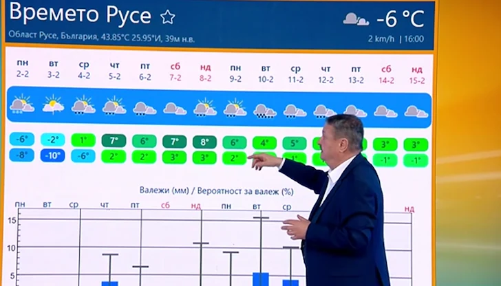 "Чак пък толкова студено не е, аз очаквах в София да бъде много студено – в момента е -2", заяви климатологът. Той уточни, че най-ниските температури са отчетени в Русе (-10 градуса) и Кнежа (-11 градуса), докато в Южна България термометрите вече показват положителни стойности.