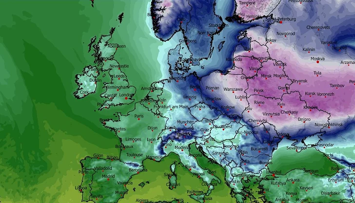 Източна Европа преживява най-интензивния период на застудяване от началото на зимния сезон. Минималните температури паднаха до критични стойности, достигайки −30 градуса в Литва и близо −26 градуса в Беларус, съобщиха от "Meteo Balkans".
