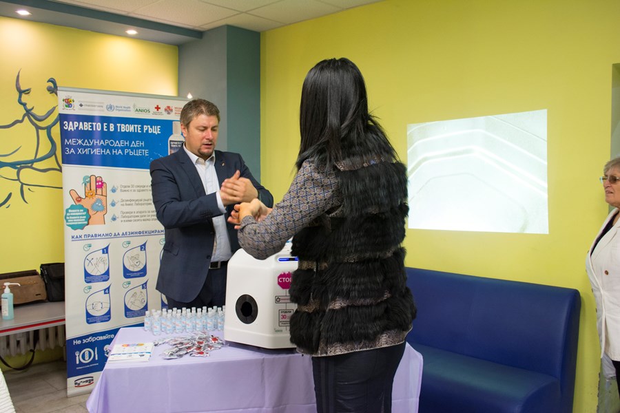 Също така тестваха качеството на дезинфекция в специалния апарат – Дидактоскоп. Апаратът показва пропуските при нанасяне на дезинфекциращия препарат. Уредът има обучителна цел, тъй като недостигнатите от дезинфектанта зони остават по-тъмни. Така всеки може да види пропуските си и да наблегне на измиването на труднодостъпните места. Проявилите интерес към теста получиха подарък опаковка алкохолен дезинфектант за ръце и материали за кампанията.