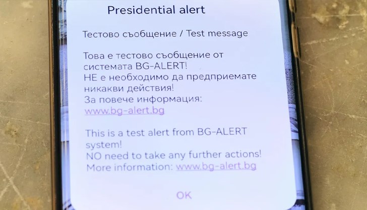 По време на теста ще бъдат активирани акустични сигнали, които ще бъдат съпътствани от гласова информация. Системата BG-ALERT, предназначена за изпращане на съобщения до мобилните телефони на гражданите, също ще бъде тествана в периода от 11:00 до 11:30 часа, посочва информацията от официалния сайт на системата.
