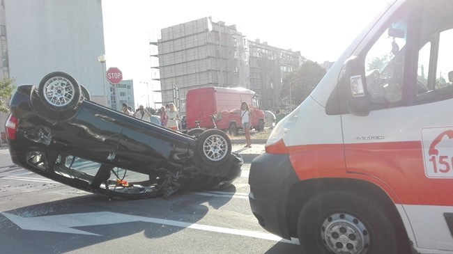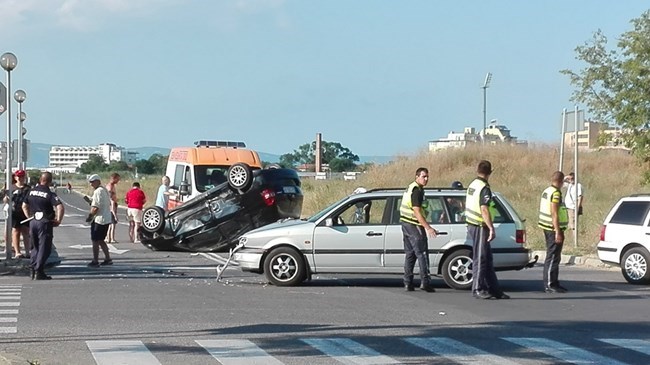 Зрелищна катастрофа между два леки автомобила на кръстовище в Поморие стресна цял квартал в морския град, съобщава 24 часа.