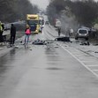 Силата на сблъсъка е била толкова голяма, че двигателят на германския автомобил е бил изхвърлен на пътното платно. Предната част на по-малкия товарен автомобил също е сериозно деформирана от удара.