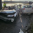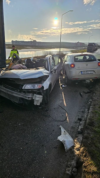 Едно от леките превозни средства е напълно унищожено вследствие на силния удар и части от него са разпилени по пътното платно.