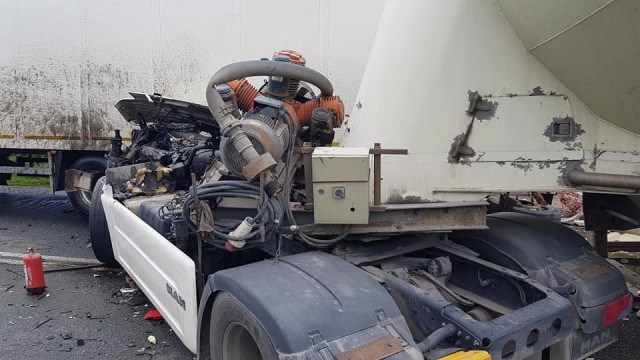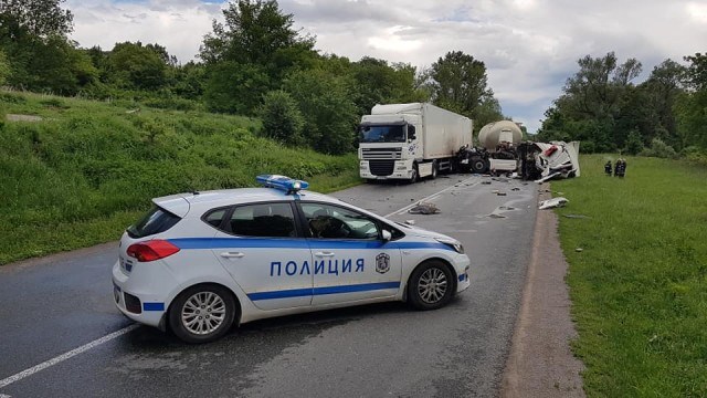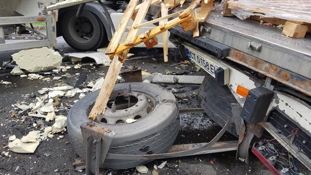По неизяснени към момента причини ТИР със старозагорска регистрация спира внезапно и в него се удря идваща отзад цистерна, превозвала цимент.