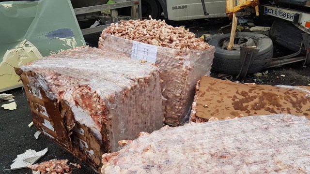 Камионът е превозвал месни продукти за Италия. Очевидци разказват, че на мястото на инцидента се носи неприятна миризма – на развалено месо.