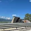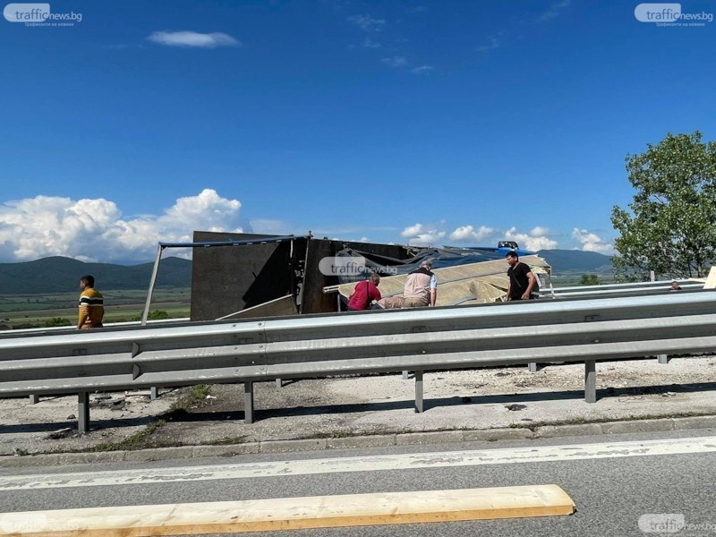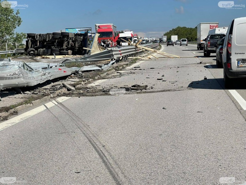 ТИР е преминал защитната осева мантинела, в следствие, на което се е ударил челно с друг тир и се е преобърнал на пътното платно, съобщи TrafficNews.