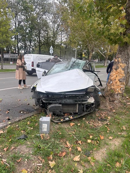 По първоначална информация лек автомобил е преминал с висока скорост през кръстовището с улица “Котовск“, закачил е друга кола и се е забил в дърво.