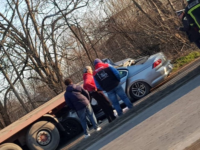 Автомобил Фолксваген Пасат се е блъснал в ремарке на тежкотоварен камион. От удара предната част на колата е силно намачкана.
