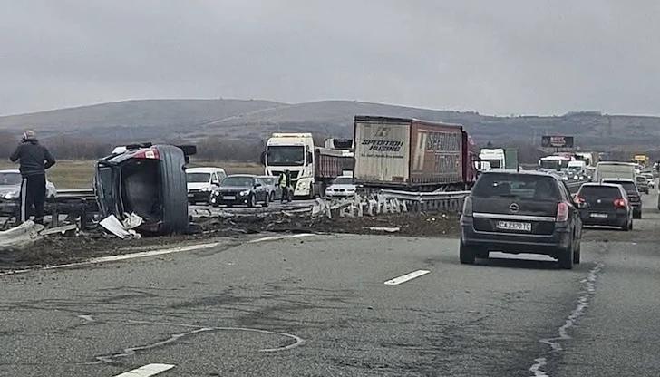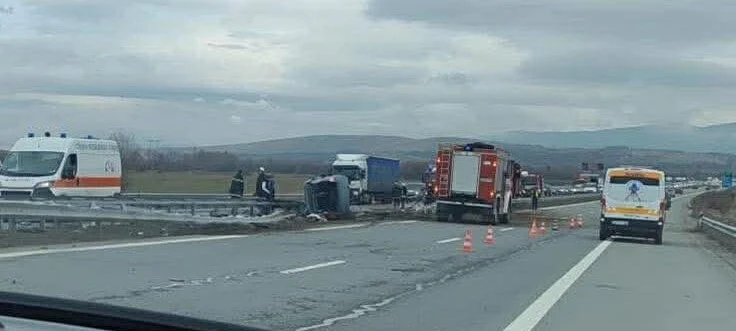 При сблъсъка лекият автомобил е изхвърчал в еластичната ограда и се е преобърнал на пътното платно. По първоначална информация няма тежко пострадали граждани, но материалните щети по превозните средства са значителни.