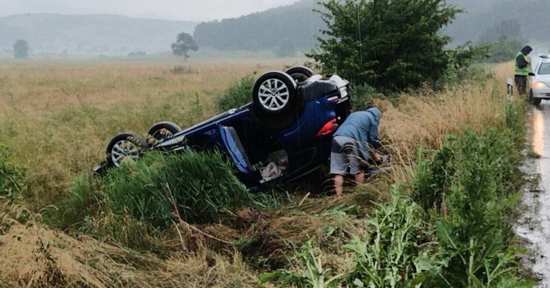 При катастрофата са се сблъскали два леки автомобила, при което единият шофьор губи контрол на управлението и се преобръща по таван встрани от пътя.