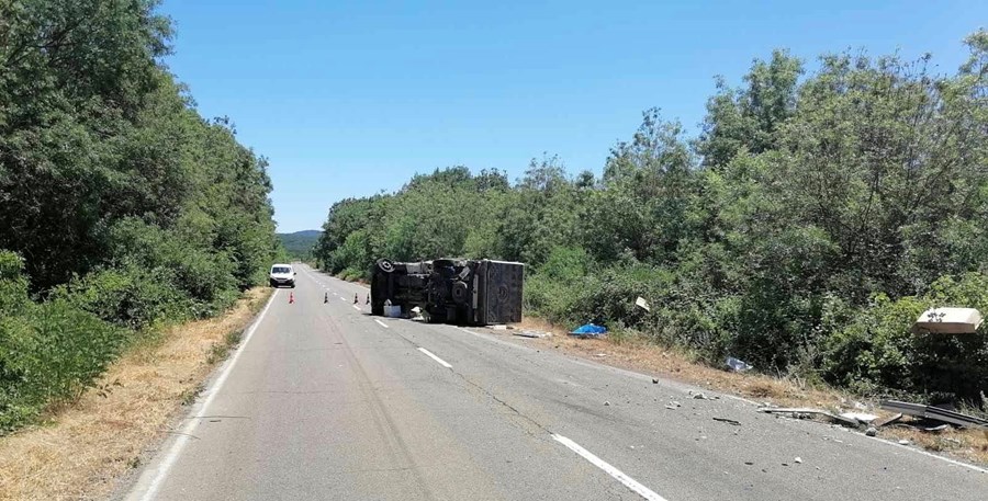 Вследствие на силния удар камионът се е преобърнал на пътното платно. Всички трима души от леката кола са транспортирани в болнично заведение за медицинска помощ, съобщиха от Областната дирекция на МВР – Бургас.