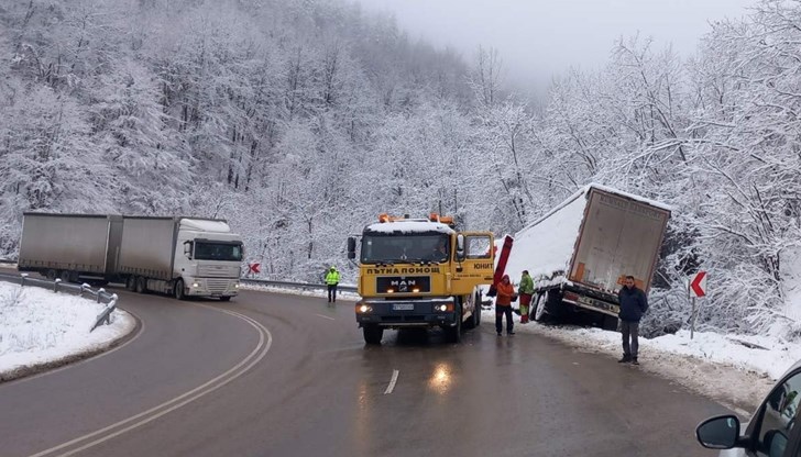"ТИР аварира в Хаинбоаз. Наложи се да бъде изтеглен със специализирана техника. Товарният автомобил е извън пътното платно и не затруднява движението на автомобили през Прохода на Републиката", заяви тя, визирайки предприетите действия по изтегляне на машината.