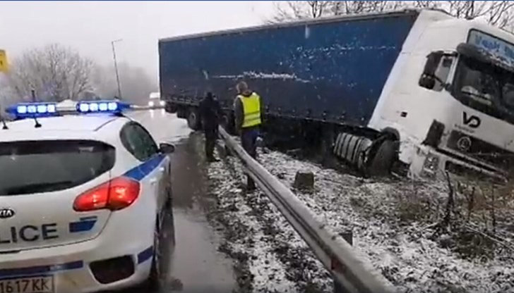 В условия на силен снеговалеж и мокра пътна настилка товарния автомобил е излязъл от пътното платно. При инцидента няма пострадали.