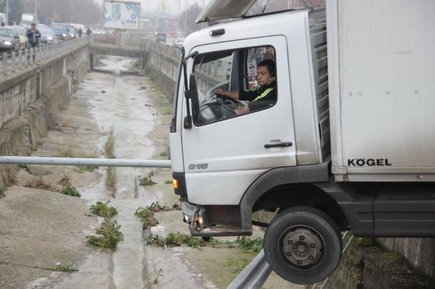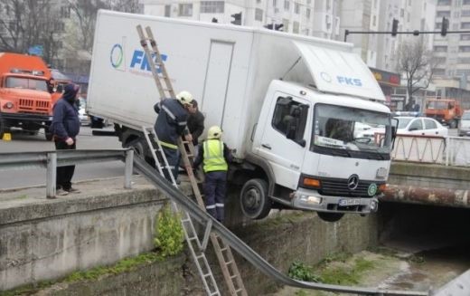 Камион „Мерцедес“ със софийска регистрация за малко не падна в река „Поройна“ в Шумен. Инцидентът стана тази сутрин на кръстовището на зала „Младост“.