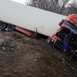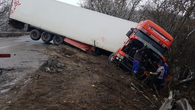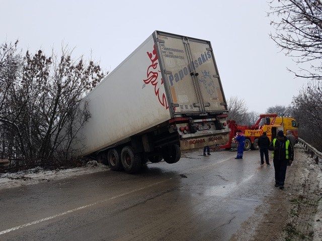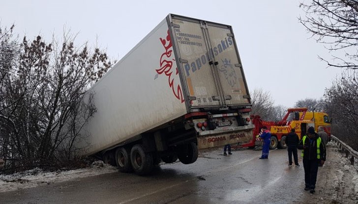 По неясни засега причини тир, натоварен с плодове и зеленчуци от Гърция за Румъния, излиза от шосето и се забива в крайпътното дере.