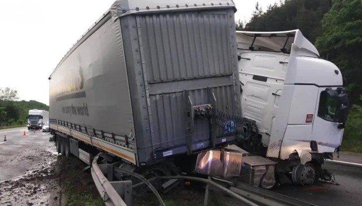 Тирът преминал през мантинелата, като една част от него се намира в платното посока София, другата в посока Бургас.