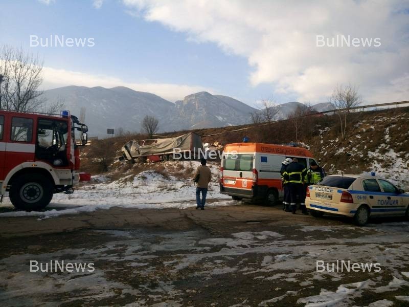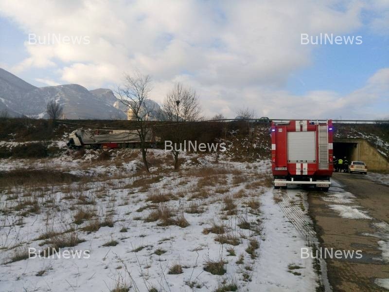 След това тежкият камион скъсал мантинелата и е паднал в дере в ляво по посока на движението. На мястото има две пожарни, линейка и полиция.