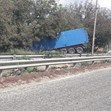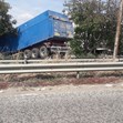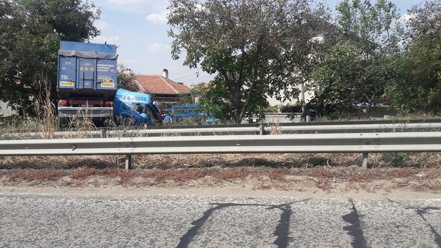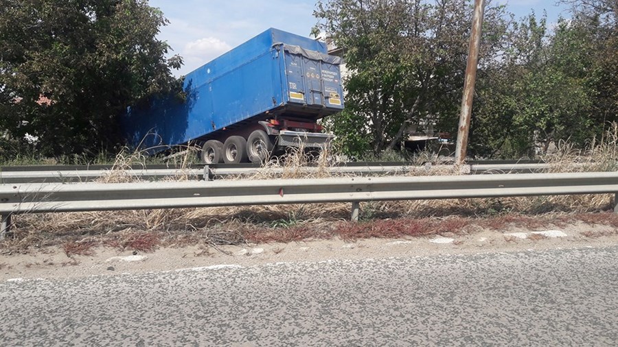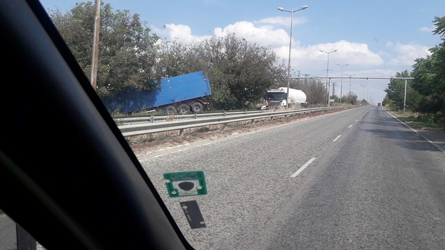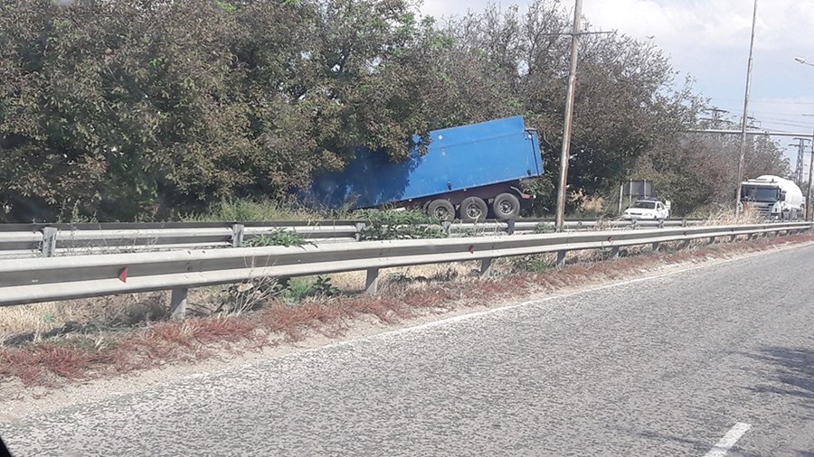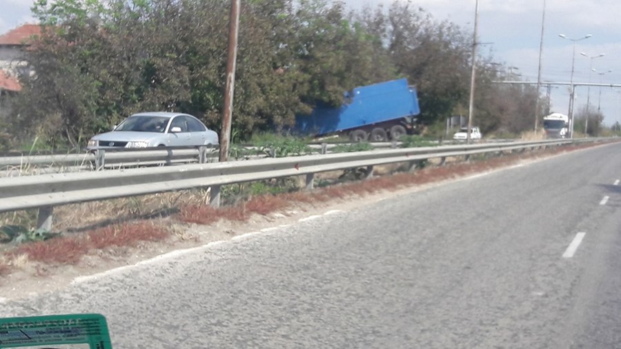 От снимки, споделени в социалната мрежа, се вижда катастрофирал ТИР, който се е прехвърлил наполовина през мантинелата и е спрял на метри от близки до платното къщи.