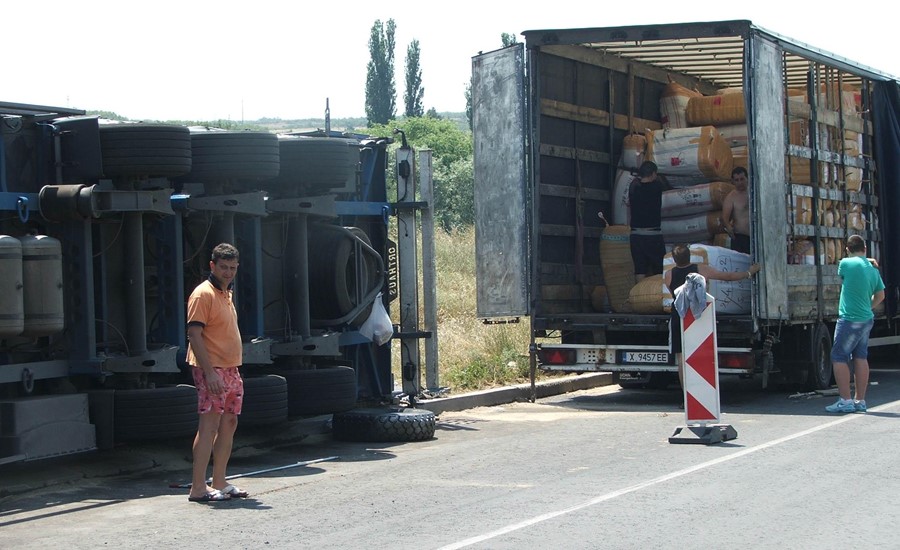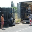 ТИР пълен с платове се обърна край Автогарата на Симеоновград.