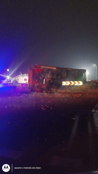 ТИР се обърна на кръговото кръстовище край село Мало Конаре
