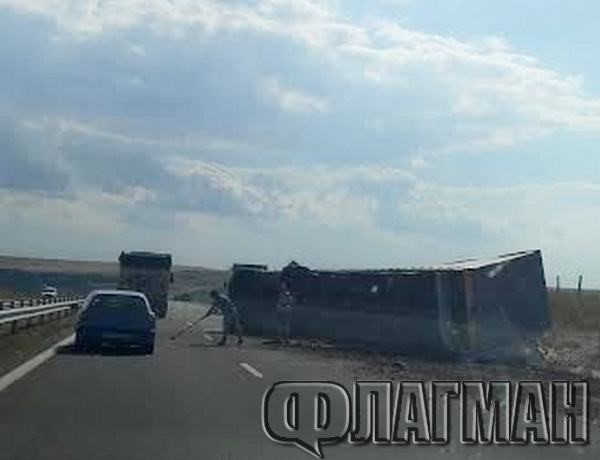 ТИР се обърна на АМ "Тракия" край Карнобат, съобщават читатели, цитирани от Флагман.