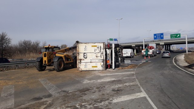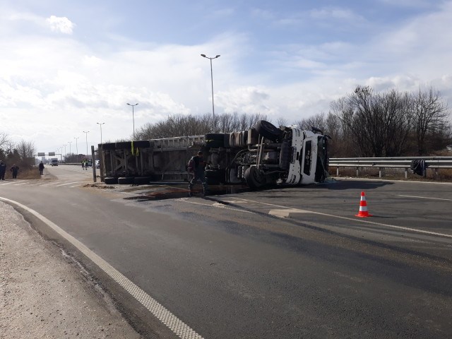 ТИР с 15 тона био-тор се обърна на един от изходите на магистрала „Тракия“ край Пловдив.
