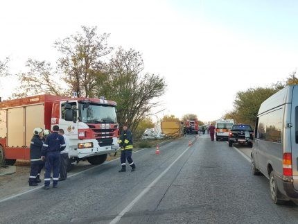 Автомобилът е с турска регистрация, обърнал се е в крайпътната канавка, част от товара е разпилян.
