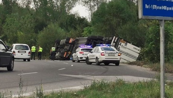 На мястото на катастрофата има патрул на Пътна полиция, който работи по документирането на катастрофата. Камионът е почти извън пътното платно и не създава проблеми за останалите участници в движението.