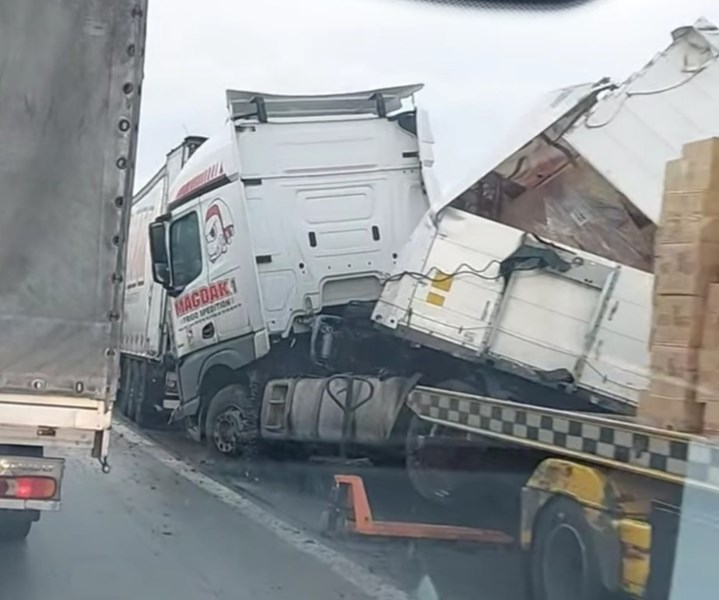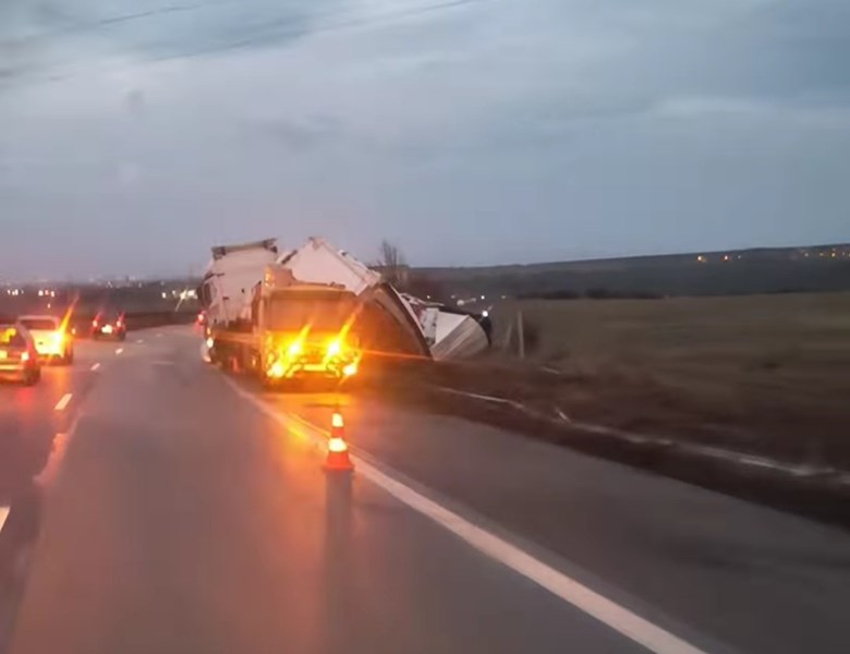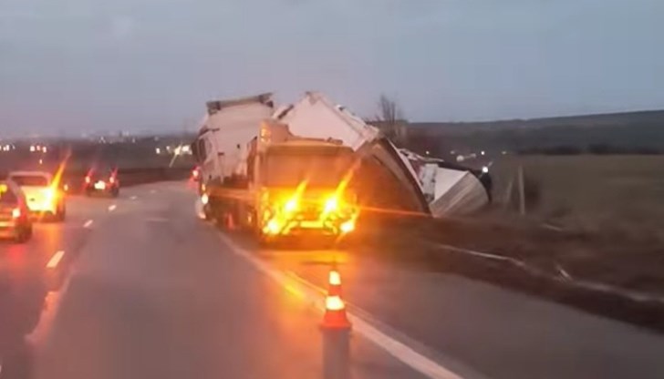 Влекачът е спрял в аварийната лента, а ремаркето е паднало в крайпътната канавка. В момента се извършва претоварване на стоката, като движението се осъществява в една лента под надзора на полицейски екипи.