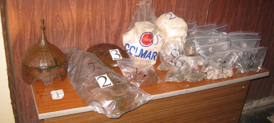 В условията на неотложност граничен полицай от ГПУ Видин е започнал първи действия по разследване по досъдебно производство - оглед на местопроизшествие и изземване на веществени доказателства, носещи белези на културни ценности. Сред откритите вещи е имало 3 523 метални кръгли монети с различна форма, метален шлем за глава на човек, метален шлем за глава на кон, метална маска за лице, каменна статуетка на човешки рамене, каменна статуетка на човешка глава, 79 метални върхове на стрели.