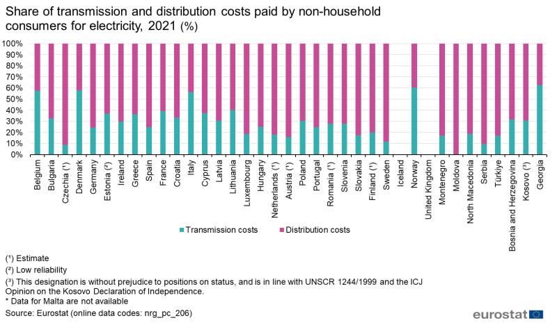 Някои небитови потребители обаче могат да бъдат директно свързани към преносната мрежа или да използват част от разпределителната мрежа (само средно напрежение). Следователно делът на разходите за пренос може да бъде по-висок в сравнение с битовите потребители, както е случая с България.