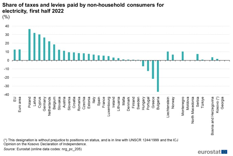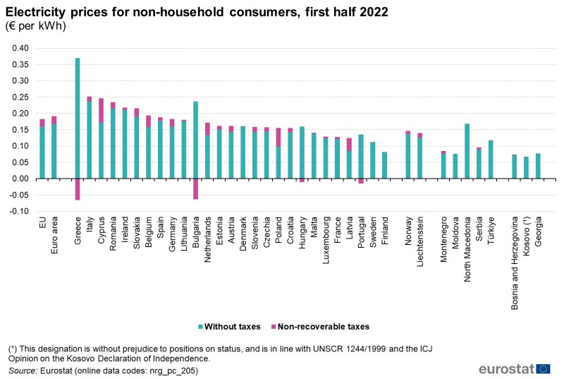 Цените на електроенергията за небитови клиенти (с потребление между 500 MWh и 2 000 MWh) през първата половина на 2022 г. са най-високи в Гърция (0,3042 евро за кВтч) и Италия (0,2525 евро за кВтч). Най-ниските цени се наблюдават във Финландия (0,0808 евро за кВтч) и Швеция (0,1117 евро за кВтч).