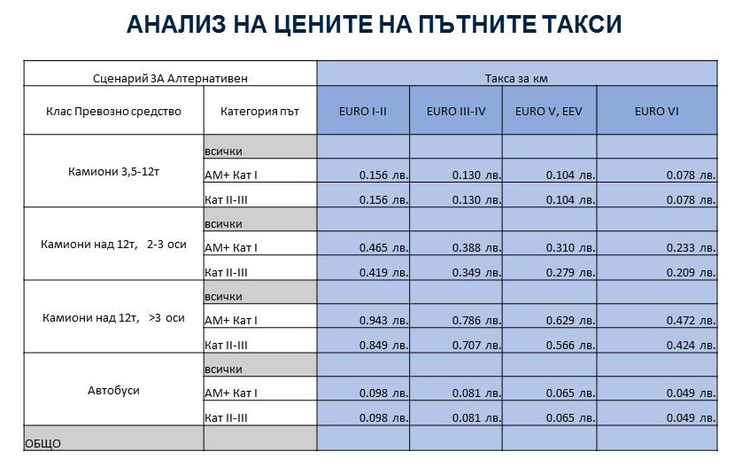 От представените пътни такси става ясно, че за камиони от 3.5 до 12 тона и за автобуси не се прави разлика по какъв път карат и ще се плаща една и съща такса в зависимост от екологичността на автомобила.