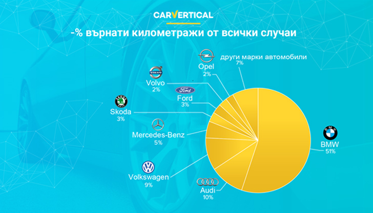 Както можете да видите от горната графика, най-купуваните марки страдат най-много от връщания на пробега, като използваните BMW-та представляват повече от половината случаи.