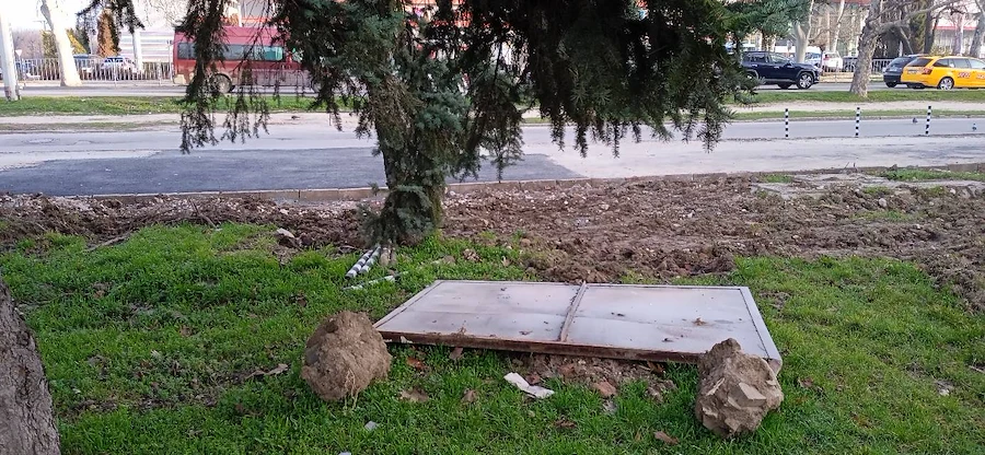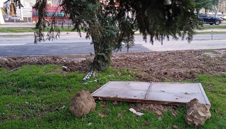 Мъжът допълва, че информационното табло за обекта е захвърлено небрежно на земята, а задължителните обезопасителни колчета изобщо не са възстановени на местата им.