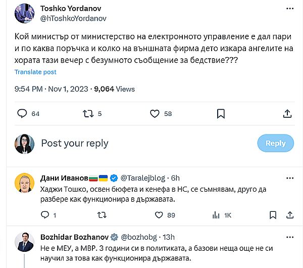 „Кой министър от министерство на електронното управление е дал пари и по каква поръчка и колко на външната фирма дето изкара ангелите на хората тази вечер с безумното съобщение за бедствие???“, написа в социалната мрежа X Йорданов.