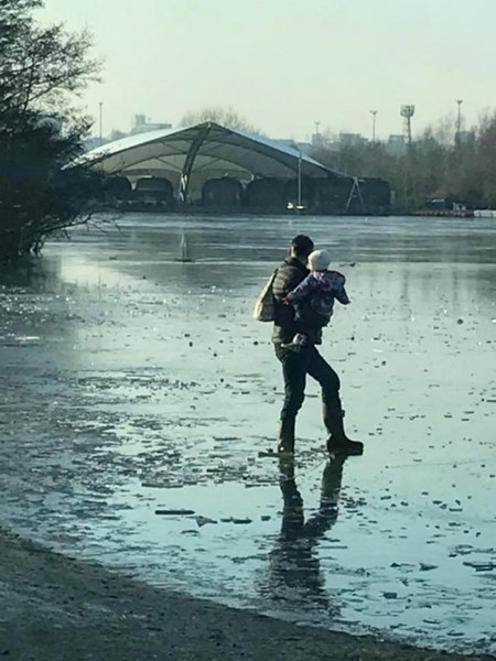 Представители на британската брегова охрана публикуваха фотография, на която мъж с дете в ръцете си се опитва да премине езеро по твърде крехкия лед.