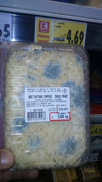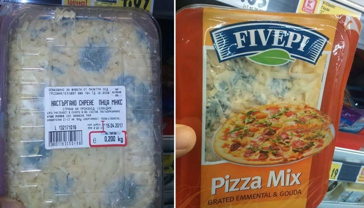 От снимките ясно се вижда, че годността е изтекла, но все още някой може да си купи това мухлясало сирене за пица.