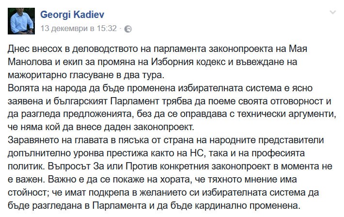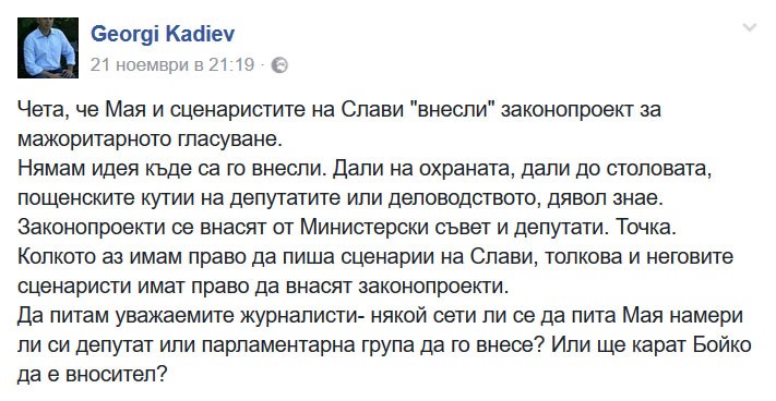 Обаче ако се върнем няколко седмици назад във времето ще видим и едно друго изказване на г-н Кадиев. На 21 ноември 2016 година Георги Кадиев е написал в социалната мрежа това: