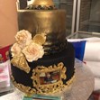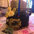Пищна двуетажна торта със златна глазура. Върху нея рози и снимка в златна рамка. Отстрани - щедро посипани 500-еврови пачки от захарно тесто.